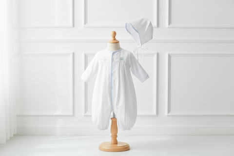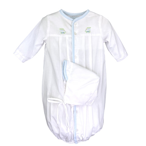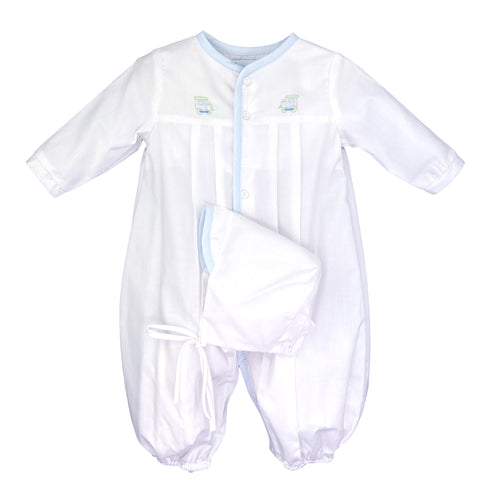 From Petit Ami, classic white batiste gown that converts to a longall. Blue trim, embroidered trains & pleats on the front, buttons on the front. Matching hat with blue trim completes the set.