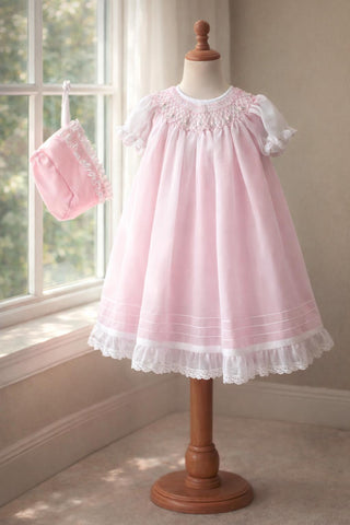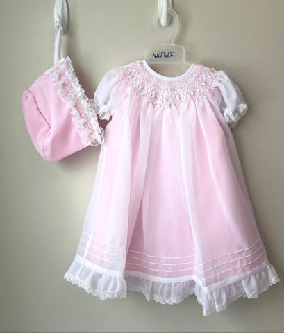 Stunning new arrival from boutique designer Will'beth. Gorgeous white sheer smocked bishop dress with beautiful detailing overlays a pink sleeveless slip creating a beautiful vintage look. White overlay is smocked with pink flowers on the smocking with pearl beading in the centers, pintucks at the hem, lace trims the puff sleeve cuffs Matching bonnet is also white overlaying pink with smocking, ruffles and floral embroidery with pearl centers. Matching white bloomers are sheer with no lining. So pretty!