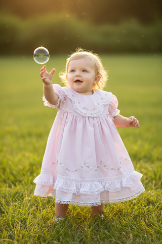 Fine attention to detail in this lovely style. Classic heirloom dress with white sheer voile overlay and soft pink lining has layers of delicate crochet trim decorating the hem of the dress, the pretty puff sleeves and sweet scallop collar. Delicate embroidered flowers in shades of pink and white with seed pearl bead centers decorate the collar and the skirt of the dress. A pretty white satin bow accents the front of the dress on each side. Buttons and ties on back with beautiful sash bow. Matching white voile bloomers
